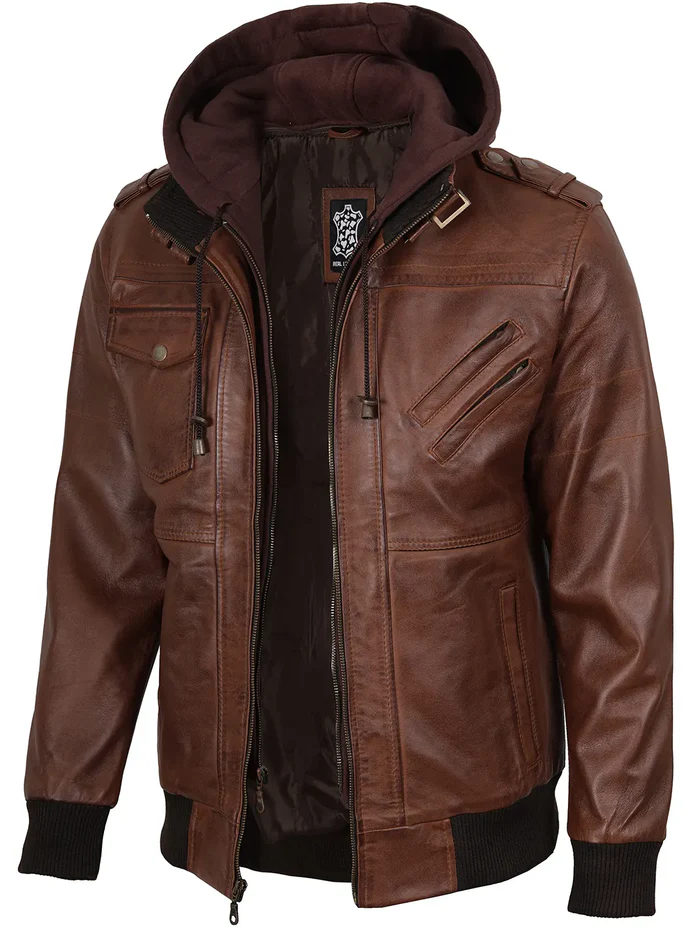 Crafted from 100% real lambskin leather, the Edgefield Cognac hooded bomber brings warmth, versatility, and standout style. The rich waxed cognac finish adds a modern, premium touch, while the detachable inner hood gives you the flexibility of two looks—clean leather for classic days and a layered, casual vibe when needed. Inside, the soft polyester lining keeps the jacket comfortable for all-day wear. Practical storage includes two side pockets, a secure flap pocket, two zippered chest pockets, and interior compartments with an extra slot for your phone. Rib-knit cuffs and hem create a snug, structured fit that completes the bomber silhouette. Whether styled with or without the hood, this jacket delivers a confident, refined look perfect for cooler seasons and everyday outings.