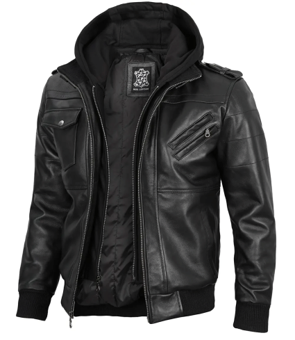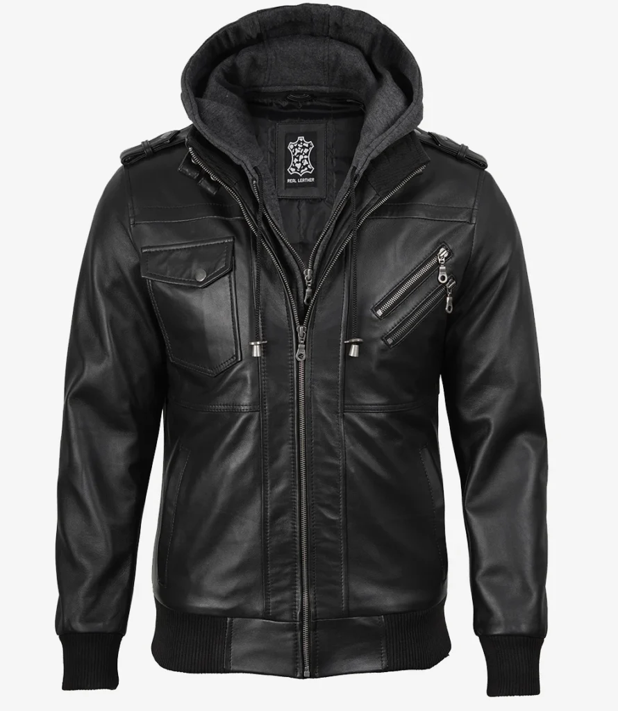 A modern men’s black leather jacket designed for everyday wear with a rugged edge. Crafted from 100% real lambskin leather, it features a detachable hood, smooth YKK zipper closure, rib-knit cuffs, and multiple pockets that keep it both stylish and functional. The soft polyester lining adds comfort, making it perfect for daily use in fall and mild winter weather.